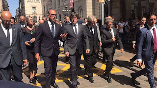“I terroristi” ha dichiarato Alfano “attaccano il nostro bene più grande che è la nostra libertà e noi dobbiamo difenderla con fierezza e orgoglio. Per difenderla è necessaria una risposta coordinata che metta insieme una strategia di intelligence, una strategia militare, una strategia culturale e il rafforzamento di tutte le norme che in tutti i Paesi contrastano il terrorismo. Hanno provato a toglierci ancora una volta il nostro bene più grande, la libertà. Il loro obiettivo è farci sentire non più liberi. Continueremo a batterci per la libertà di vivere normalmente la nostra dimensione di cittadini europei, italiani e spagnoli. Stiamo lavorando ad un piano di cooperazione con i Paesi dell’altra sponda del Mediterraneo alla formazione comune di agenzie di intelligence in quei Paesi e ad un piano concreto per elevare lo standard delle intelligence. Le nostre intelligence sono straordinarie ma possono non bastare se non c’è collaborazione dall’altra parte. Per questo proporremo questo coordinamento. Siamo qui per esprimere la nostra vicinanza ai familiari delle vittime italiane e spagnole e al governo e al popolo spagnolo e della comunità di Barcellona. Sono convinto che alla fine prevarrà sempre il nostro sforzo a difesa dei nostri ideali che sono eterni, come la libertà di movimento e di chi non aveva altro desiderio che trascorrere le proprie vacanze in questa splendida città. Quello che è successo è inaccettabile, ed è il motivo più profondo per cui oggi occorre continuare a impegnarsi. Viviamo in un mondo in cui il rischio zero non esiste e il nostro lavoro serve a diminuire questo rischio. Non è la prima volta che Roma e l’Italia vengono minacciate e non è la prima occasione in cui si dice che noi saremo il prossimo bersaglio. Il nostro livello di attenzione era e rimane altissimo ma non prendiamo la minaccia come un’azione in corso”.