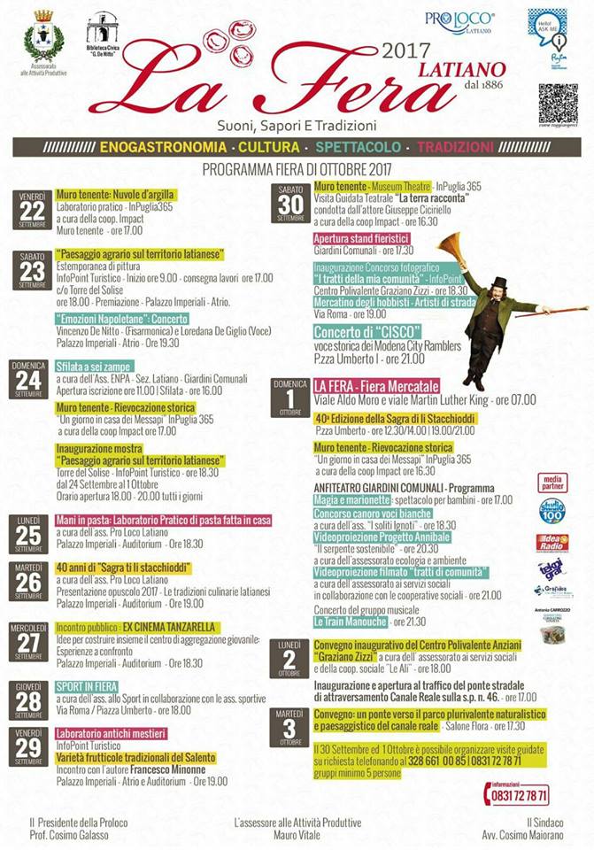 Per quel che riguarda la Fera, è un evento organizzato dal Comune di Latiano – Assessorato alle Attività Produttive in collaborazione con la Biblioteca Civica Gilberto De Nitto, la Pro Loco e con la media partnership di Idea Radio, Studio100, Teknigraf, Grafideas, Consulting Service di Antonio Carrozzo e Associazione I Soliti Ignoti. Per maggiori informazioni è possibile contattare il numero 0831727871.